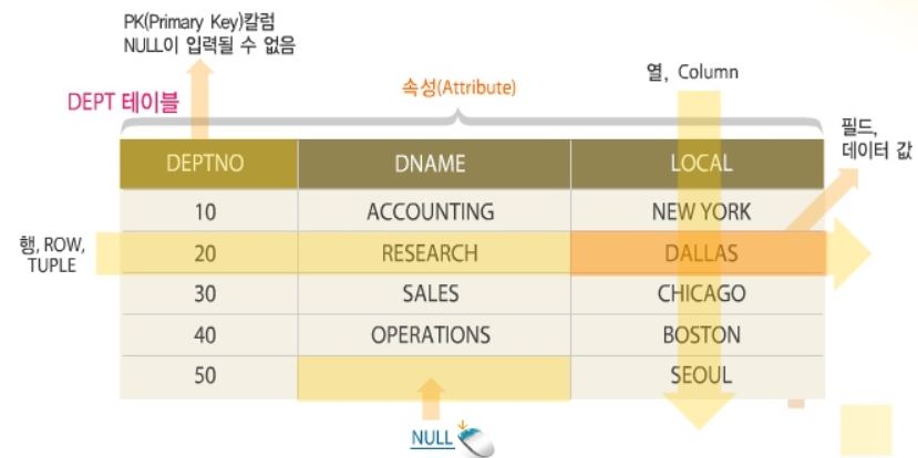 - Row : 레코드라고 불리며, 기본키(Primary Key)에 의해 구분되고 PK는 Null이 될 수 없다