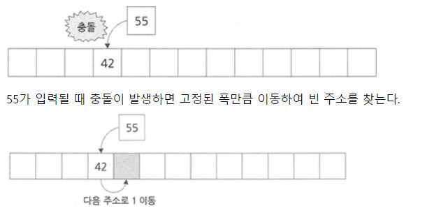 - 현재 주소에서 고정 폭만큼 다음 주소로 비어있는 주소를 발견할 때까지 이동한다!