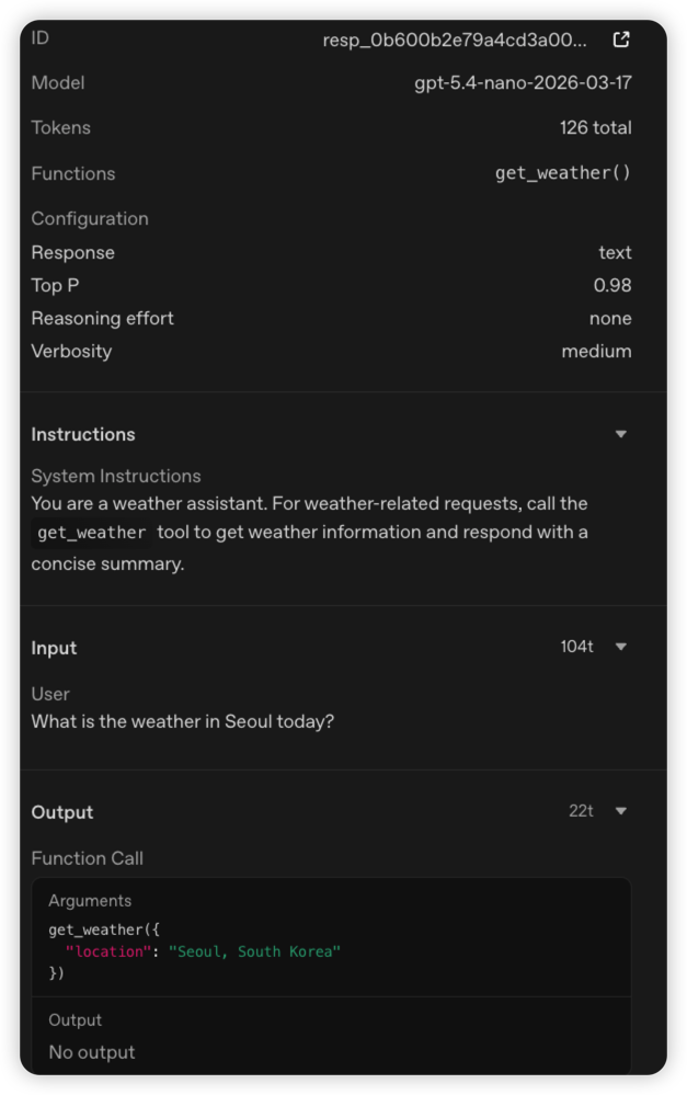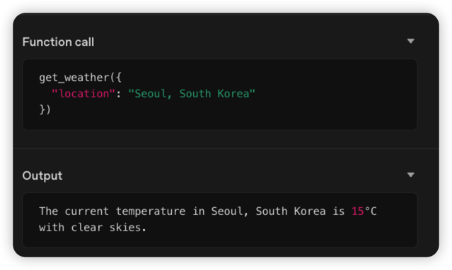 output 이 get_weather 호출과 parameter(location) 을 어떻게 지정해서 전달할 것인지를 나타냈습니다.