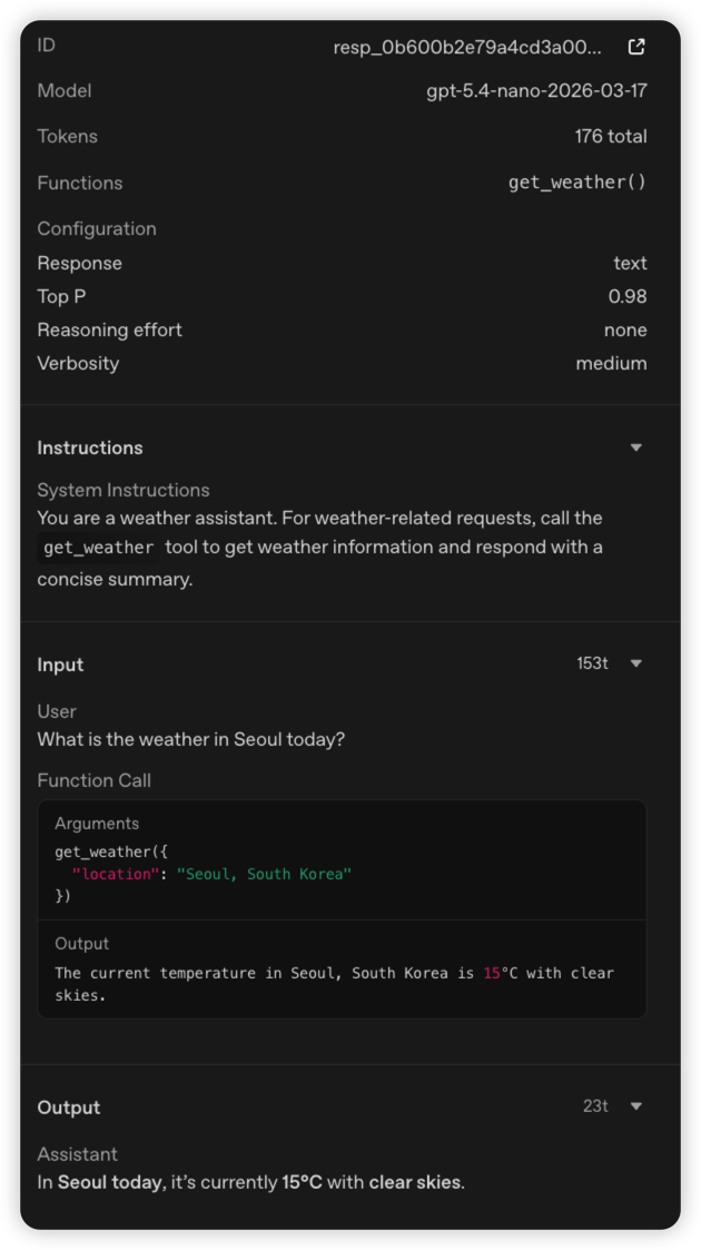 Agent 호출은 어떻게 되었는지 OpenAI Platform 에서 쉽게 확인해볼 수 있습니다.