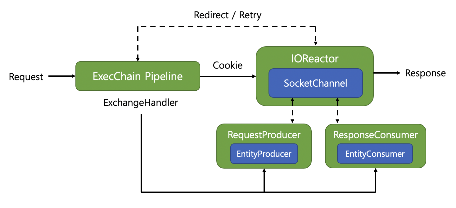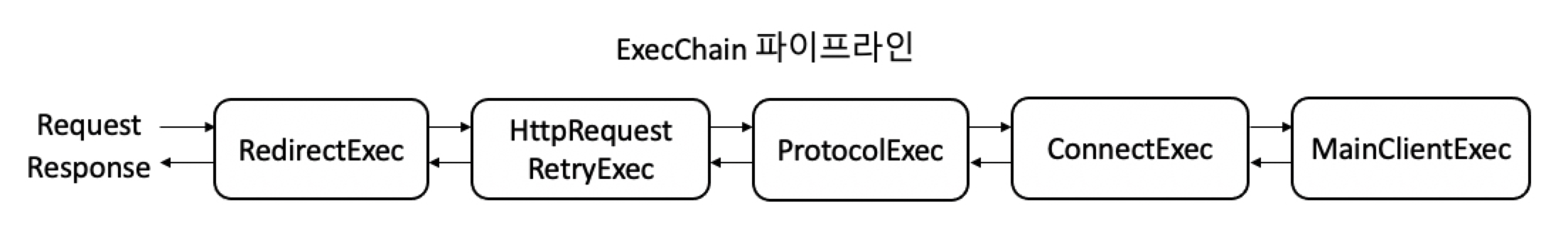 - ProtocolExec: Request 과 Response 에 인증 혹은 쿠키 처리와 같은 부가적인 일을 수행합니다.