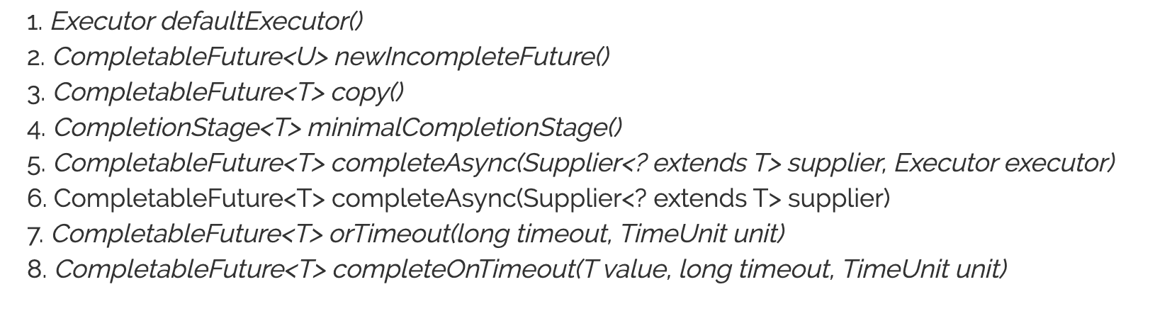 | supplyAsync | Supplier<U>, (Option) Executor | CompletableFuture<U> | Lambda를 받아서 리턴타입(U)를 반환한다 |