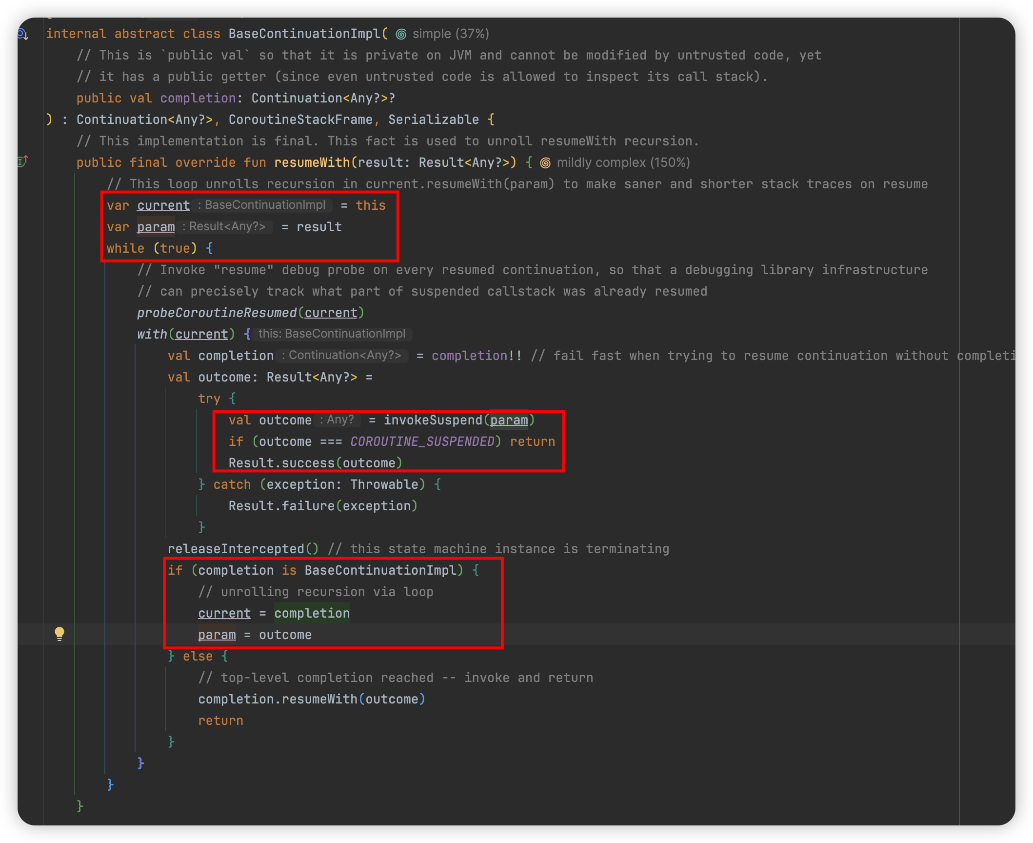 중단 함수에 대한 재실행은 큰 마법이 없다는 것을.. 단순하게 while loop 를 통해 invokeSuspend 함수를 호출해줌으로써 completion 될 때까지 반복하게 되는 것이죠.