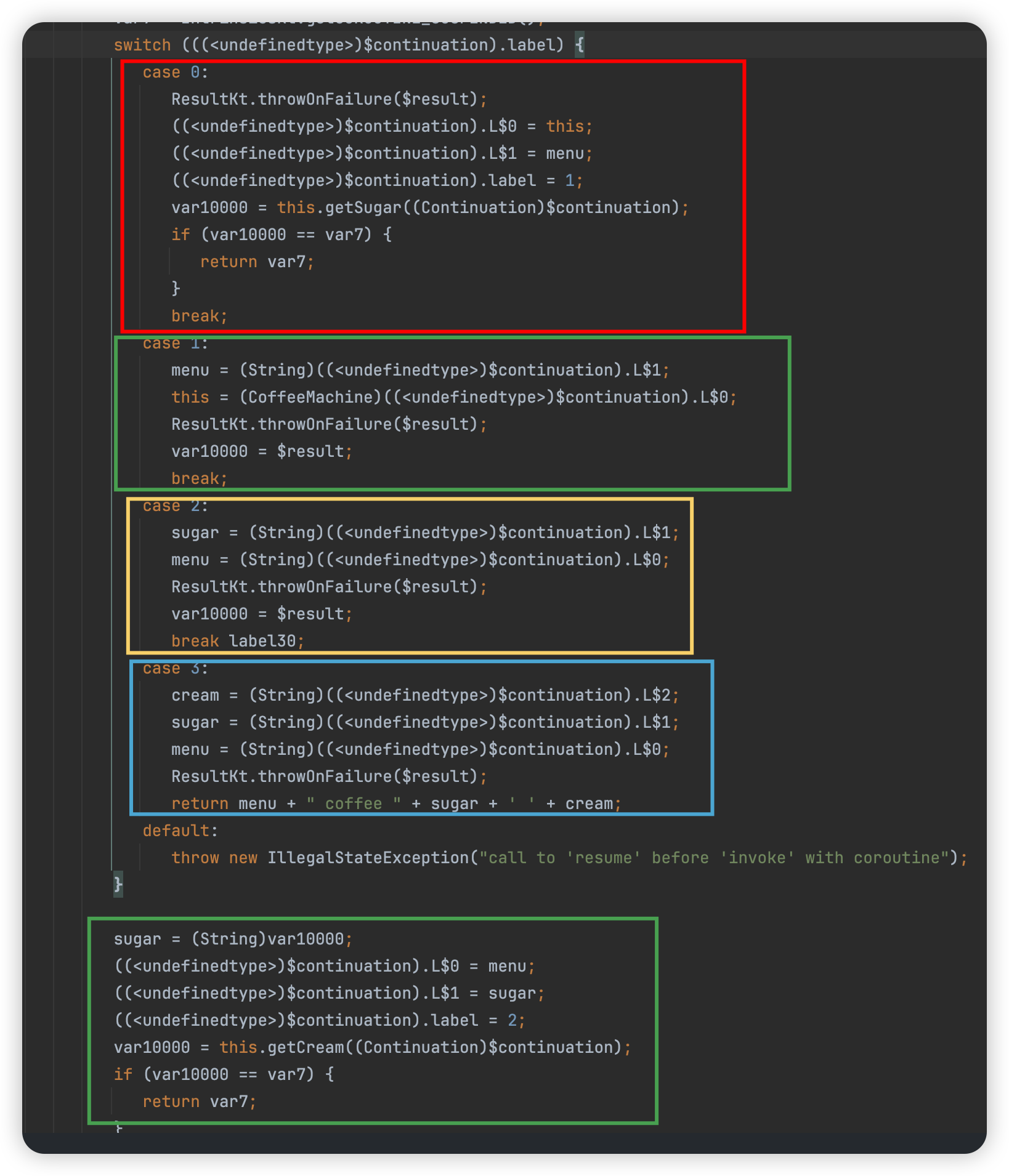 - suspend 함수의 중단점 관리는 State Machine 기반으로 kotlin compiler 가 자동으로 관리한다