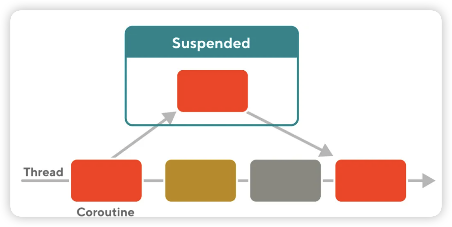 하지만, coroutine 에서는 function 을 Suspended 라는 상태로 전이한 다음에 빨간색 function 을 중단하여, 갈색 / 회색 Box 의 function 을 실행시킬 수 있습니다.
