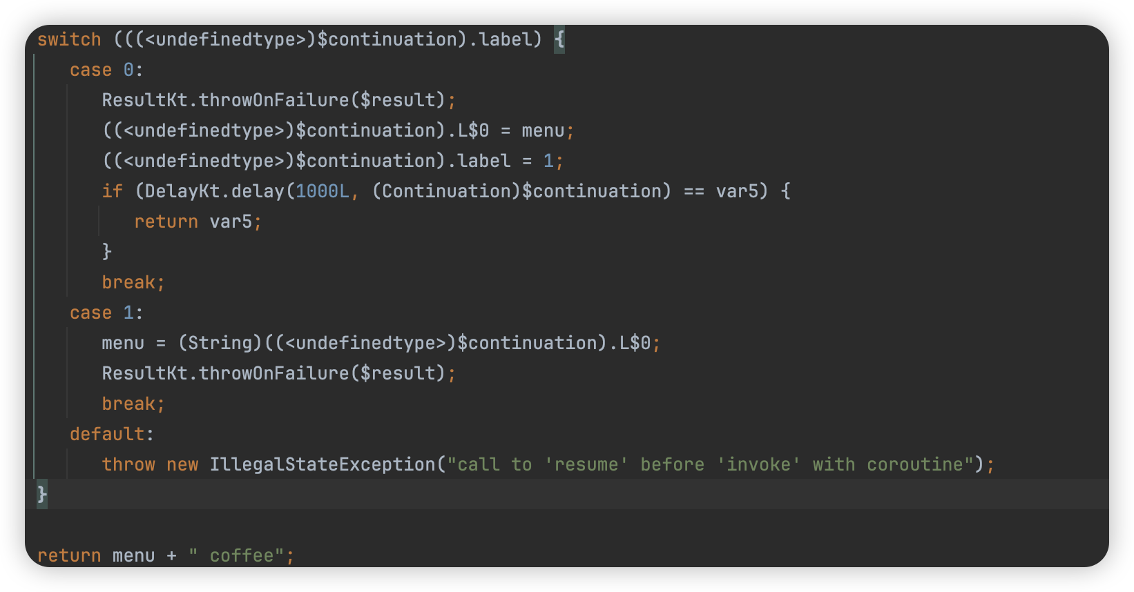 즉 label 에 대한 상태 관리를 통하여 중단가능한 지점들을 상태 관리하는 것이 suspend 함수의 가장 중요한 포인트 입니다.