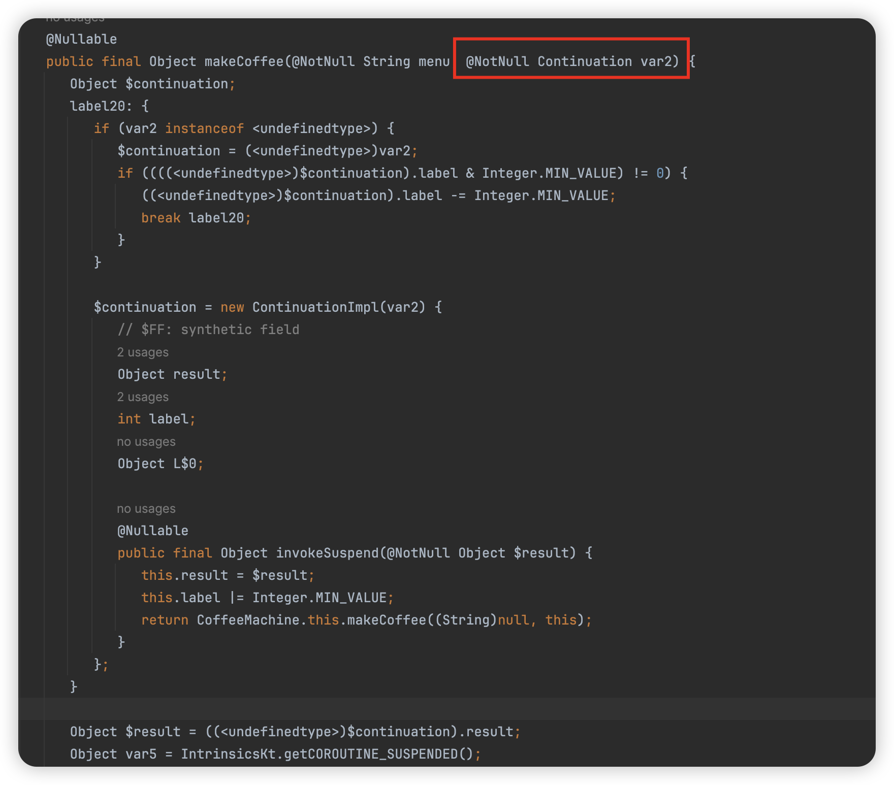 suspend function 을 decompile 해보니.. suspend 키워드는 없어지고 일반 함수로 바뀐뒤에