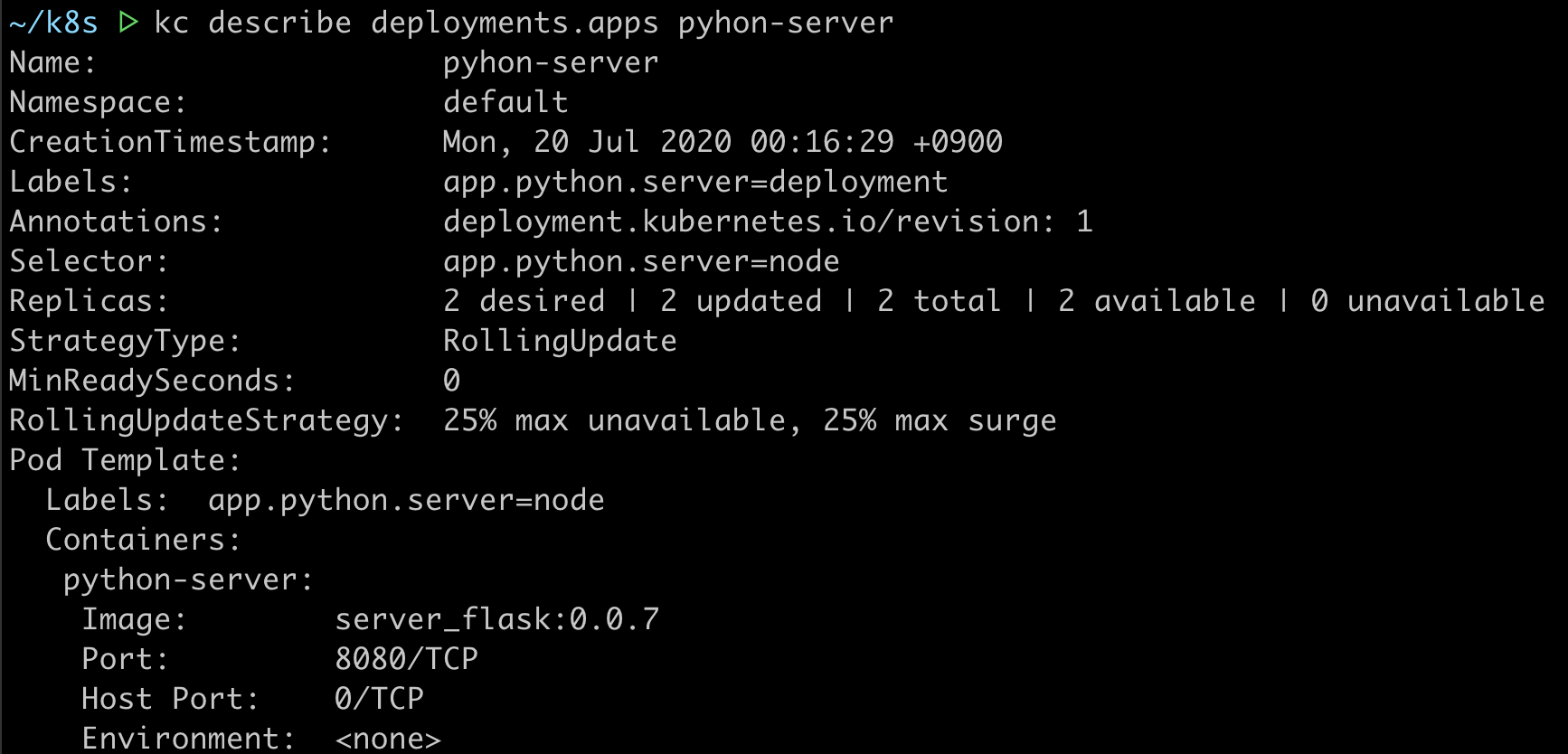 여기서는 놀랍게도 deployment가 Rolling Update라는 정책을 사용하고 있음을 볼 수 있습니다 ㅎㅎ