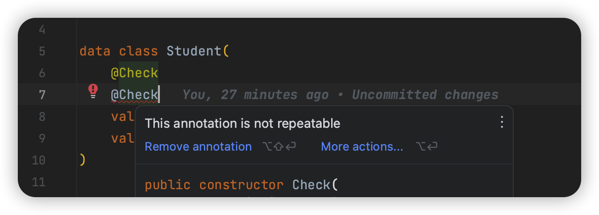 결과는 위와 같이 생성자에도 Check 가 붙고, getter 에도 붙은 것을 볼 수 있죠.