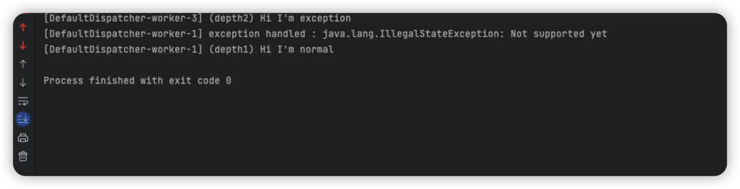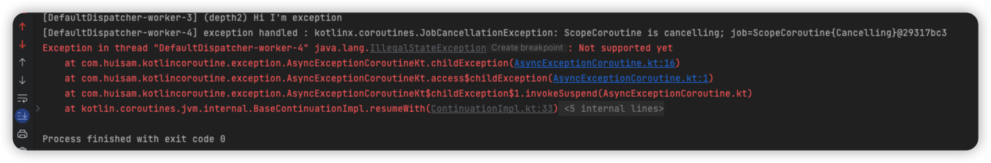 따라서 childNormal 에 대한 cancell 트리거링이 되었고, Job 에 대한 cancellationException 만 catch 했음을 볼 수 있네요