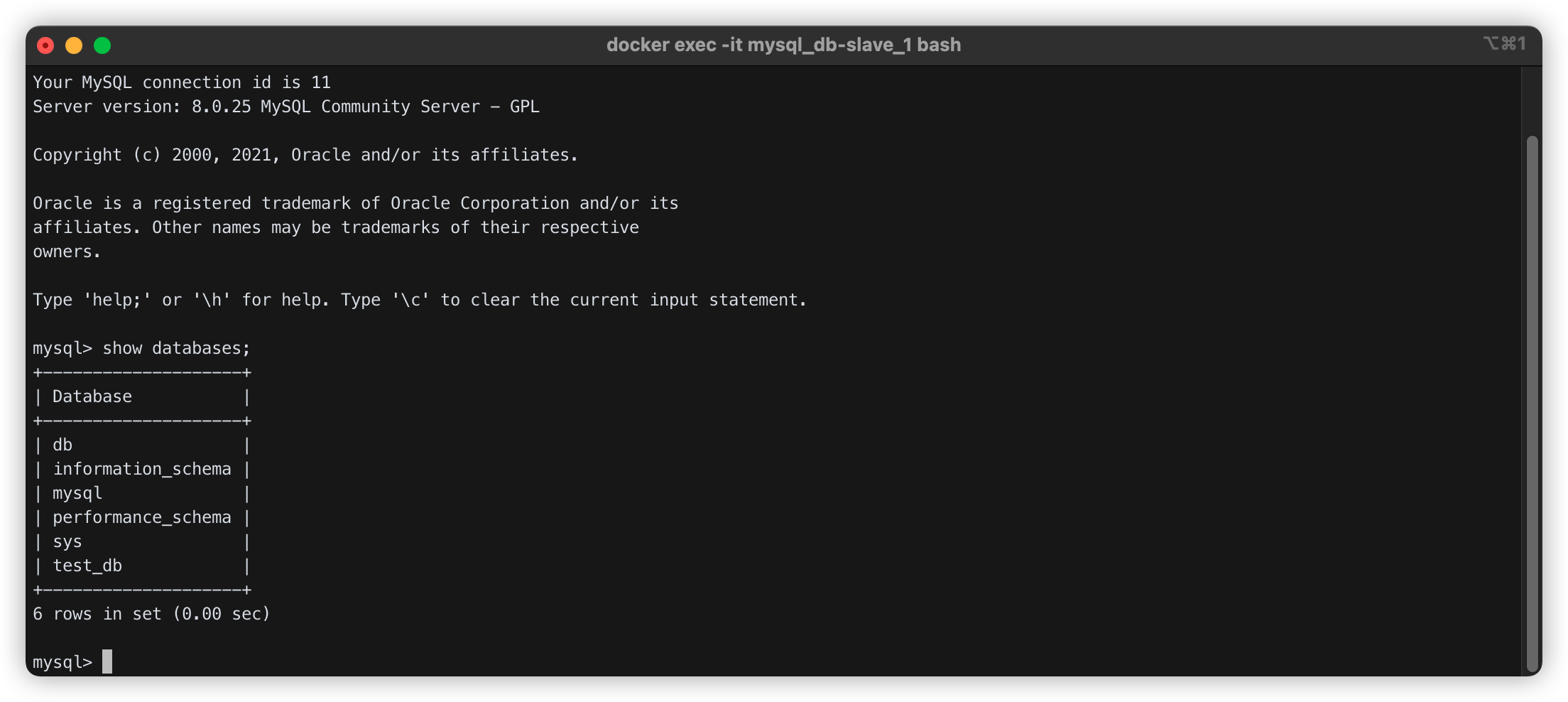 slave에 들어가서 show databases 라는 명령을 통해 db 가 생성된 것이 확인되면,