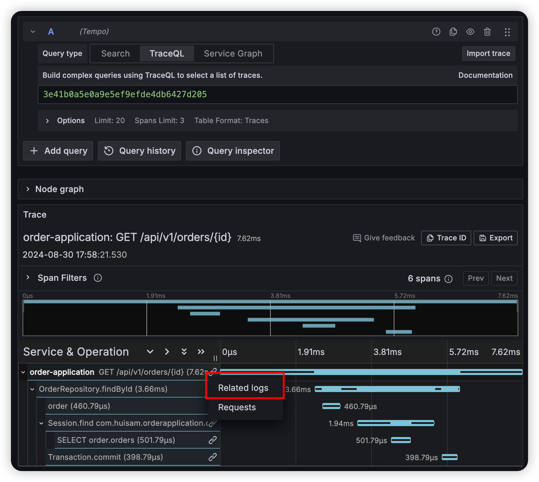 traceId 와 spanId 를 기반으로 loki 에 query 를 하여 특정 시점의 로그를 정확하게 찾을 수 있는 것이죠. 위 trace 에서 하나의 bar 로 구분되어 있는 것이 span 단위라고 이해하면 됩니다.