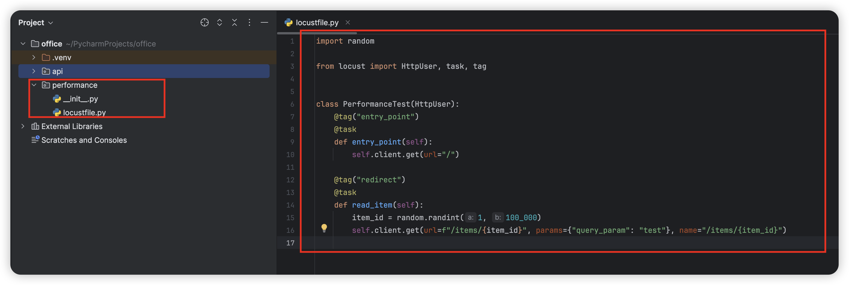 locustfile.py 라는 python file 이 entry point 가 되고, 어떤 API 를 어떤 시나리오로 테스트할 것인지 함수로 정의해주시면 됩니다.