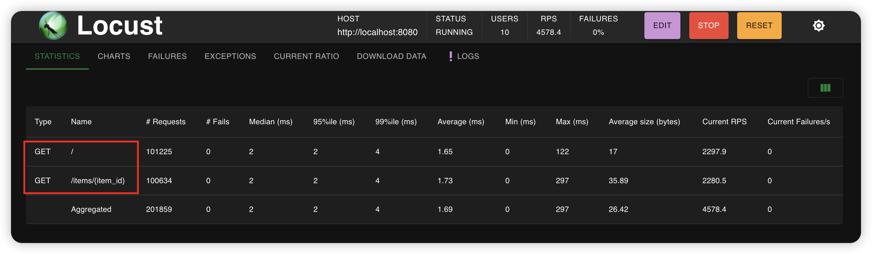 locust 기반으로 간단하게 script 를 작성했고, 2가지 API 가 개별 함수로 정의된 것을 볼 수 있습니다.