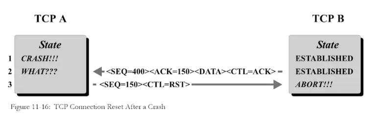이 시나리오는 TCP A 가 crash 가 일어나서, 200 SYN 로 보냈지만, ACK 가 150 으로 오는 것을 보고 client 가 server 에게 RST packet 을 전달하게 됩니다.