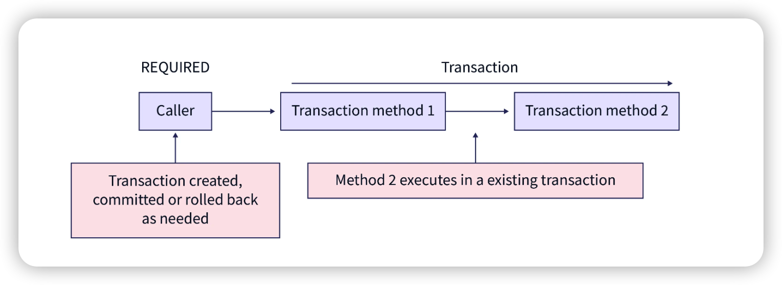 REQUIRED 설정은 그림에서 보는 것과 같이, Transaction 이 중첩되는 경우 이미 존재하는 Transaction 을 활용하게 됩니다.