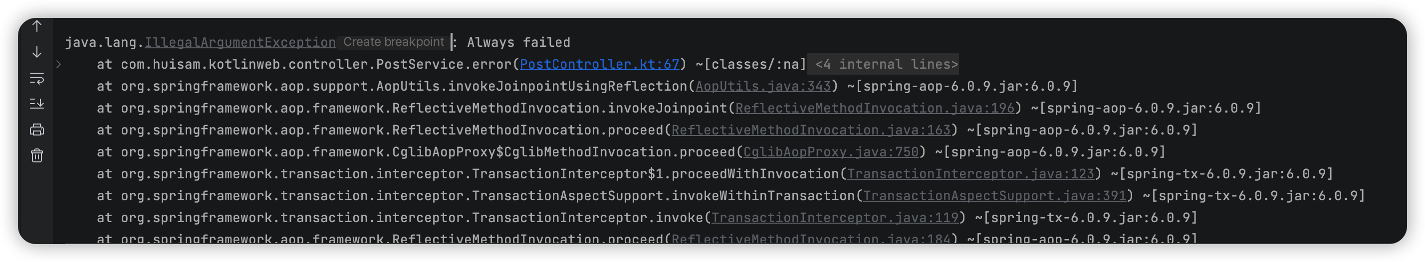 Aspect 에서 예외가 던져졌으면 뭔가작업을 하고 다시 예외를 던지는 것을 볼 수 있습니다.