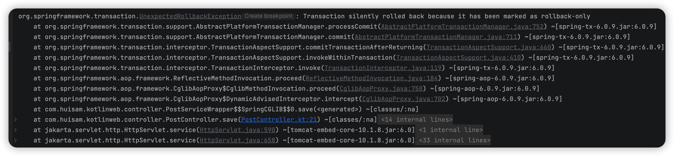 즉, Transaction 설정이 Rollback 으로 mark 되어 성공적으로 commit 을 할 수 없다는 것이죠.
