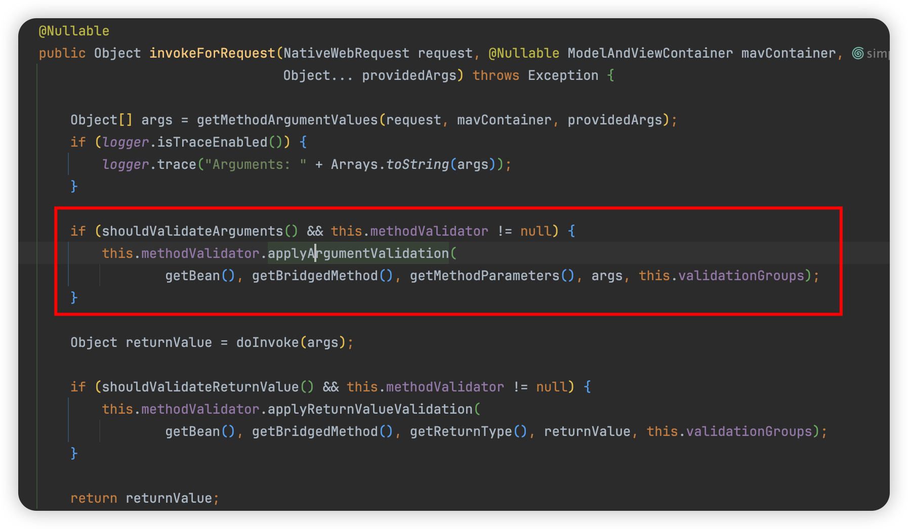 methodValidator 에 의해 검증을 진행하게되는 것을 볼 수 있네요. 내부로직은 BeanValidation 에 의해 진행되어 결과값을 가지게 된다고 이해하면 되겠습니다.