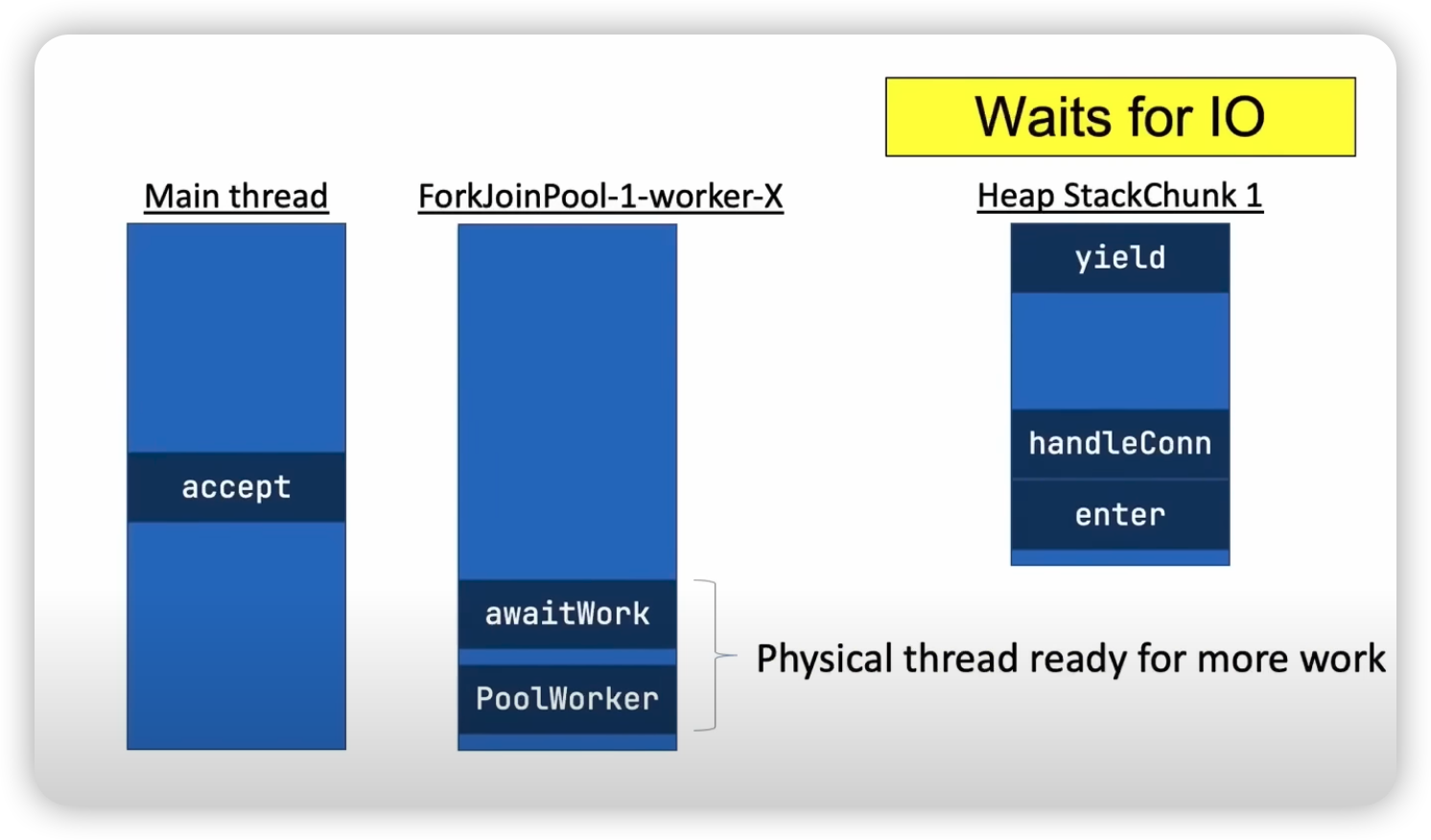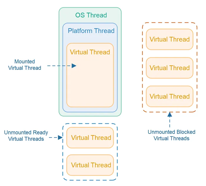 Virtual thread 는 기존에 동작하는 Platform thread 에서 동작하며, I/O blocking 발생시 중단(suspend) 지점을 stack 으로 옮겨, I/O block 되는 시간동안 다른 일들을 더 수행할 수 있게 지원하는 경량화 쓰레드라고 할 수 있습니다.