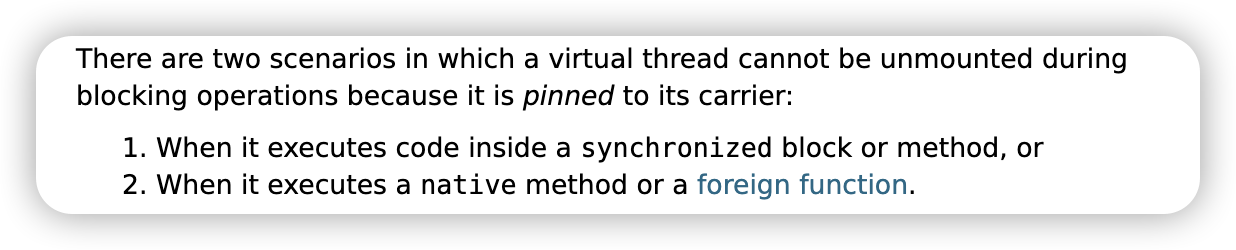 왜냐하면 native method, synchronized 는 둘다 platform thread 를 pinning 할 수 밖에 없는 상황에 처하기 때문입니다.