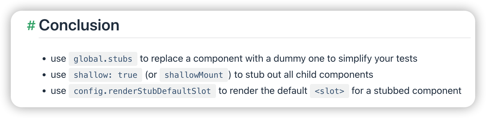 그래서 일반적으로는 shallow: true 를 사용하시거나, shallowMount 함수를 이용하게 됩니다 :)